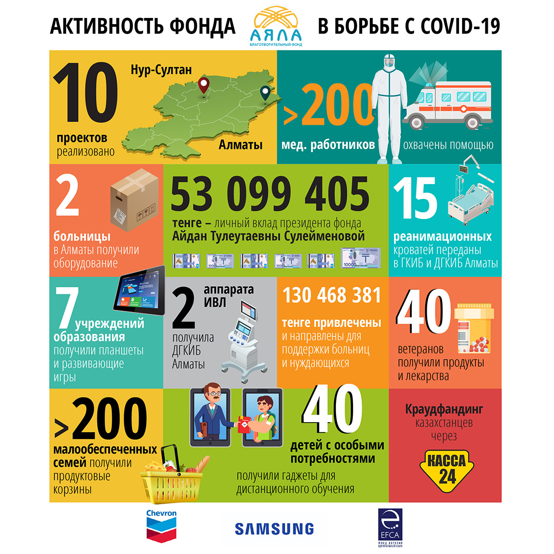 10 проектов для помощи в борьбе с COVID-19 в Казахстане с привлечением более 130 млн тенге от крупных спонсоров, перечислений казахстанцев, и благодаря личному вкладу президента фонда Айдан Тулеутаевны Сулейменовой, который превысил 53 млн тенге!